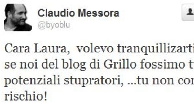 Claudio Messora, responsabile comunicazione del M5S al Senato, rincara la dose e scrive un tweet offensivo su Laura Boldrini. Il messaggio è stato poi cancellato dall'autore, ma ormai ha già fatto il giro della rete. "Cara Laura, volevo tranquillizzarti... Anche se noi del blog di Grillo fossimo tutti potenziali stupratori,... tu non corri nessun rischio!", scrive il blogger.