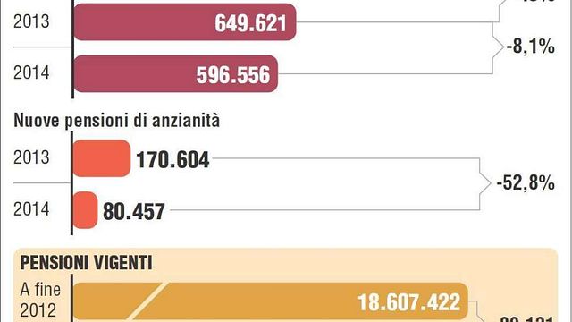 "Con la riforma Fornero crollano i nuovi pensionati" - Nel 2013 sono stati state liquidate 649.621 nuove pensioni con un calo del 43% rispetto ai 1.146.340 nuovi assegni liquidati nel 2012. E' quanto emerge dal confronto tra il bilancio preventivo Inps per il 2014 e il bilancio sociale dell'Istituto per il 2012. La differenza del numero di nuovi pensionati dipende in massima parte dall'entrata in vigore nel 2013 della riforma Fornero che ha alzato l'età pensionabile.
