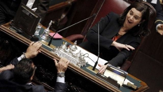 Nuova performance di Gianluca Buonanno (Lega) durante la votazione sulla fiducia al Dl Carceri. Il leghista, che aveva esibito poco prima in Aula un paio di manette, al momento di votare contro la fiducia prima espone un cartello come tutti i suoi colleghi. Quando i commessi glielo strappano dalle mani per ordine della presidente Boldrini, Buonanno non si perde di animo: si aggrappa al banco della presidenza e prova a sollevarsi per salutare la presidente. Ma le forze gli mancano. Ritorna sui suoi piedi. Sconsolato, si avvia verso l'uscita tra l'ilarità dei presenti.