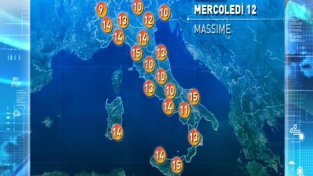 Oggi temperature massime in rialzo al Nord, in calo invece nel Medio Adriatico e al Sud. Previsti 13°C a Bologna e Torino, 14°C a Milano, Verona, Roma, Napoli, 15°C a Firenze, Pescara, Bari, Taranto, Palermo, Olbia, 17°C a Catania.