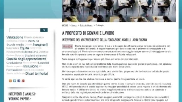 Elkann ha poi proseguito: "Sappiamo anche che alcune lauree offrono maggiori possibilità: conseguire un titolo di studio tecnico-scientifico richiede grande fatica e determinazione, ma nella stragrande maggioranza dei casi lo sforzo viene ripagato: ad esempio più di 9 laureati in ingegneria su 10 risultano occupati a 4 anni dalla fine degli studi". "Anche per chi si impegna per conseguire un serio attestato professionale - osserva ancora Elkann - si aprono opportunità: le rilevazioni sui fabbisogni professionali delle imprese italiane evidenziano con cadenza regolare le aree in cui l'offerta lavorativa fa fatica ad essere soddisfatta. Questo sposta il problema su come assicurare un'adeguata informazione e uno sforzo di orientamento, per permettere alle famiglie e agli studenti di fare scelte consapevoli e utili. E solleva il tema sull'importanza di investire sull'istruzione, aumentando e non certo riducendo le risorse da assegnare alla scuola, soprattutto quella pubblica. Su questi temi la Fondazione Agnelli conferma l'impegno a fornire il proprio contributo, attraverso iniziative e ricerche: proprio mercoledì prossimo, a Roma, verrà presentato un nuovo Rapporto, dedicato ad un tema cruciale come la valutazione della scuola".