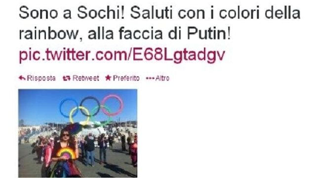 Vladimir Luxuria ha sfidato ancora una volta la legge russa contro la propaganda gay. Dopo essere stata fermata domenica con una bandiera arcobaleno, è entrata al parco olimpico dei Giochi di Sochi gridando: "Essere gay è ok". "Sono qui per dire a Putin che la modernità è anche l'apertura mentale in tema di diritti per la difesa delle minoranze sessuali", ha spiegato Luxuria vestita in versione arcobaleno.