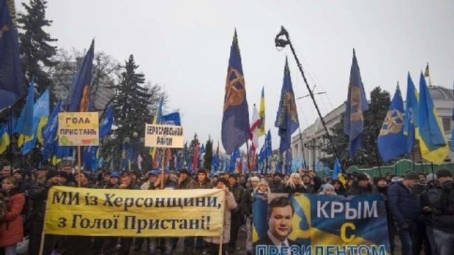 A Kiev "hanno preso il potere i fascisti". Questo lo slogan dei circa 2mila manifestanti scesi in piazza per dimostrare a fianco dei movimenti pro-russi a Sebastopoli, in Crimea, dove fa base la flotta russa. I dimostranti sventolavano bandiere ucraine, russe e della flotta del Mar Nero. "Il nuovo potere - ha detto un oratore dal palco - vuole privare i russi dei diritti e della cittadinanza" .