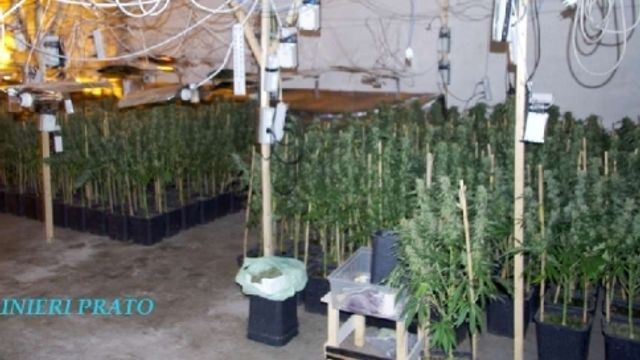 Una piantagione di marijuana è stata scoperta dai carabinieri in un capannone industriale di Vaiano, nella val di Bisenzio, in provincia di Prato. Nella struttura, di circa mille metri quadrati, erano state posizionate lampade speciali, un soppalco per mantenere la temperatura funzionale alla coltivazione delle piante e un impianto di irrigazione. Sette cittadini di origine cinesi sono stati arrestati. Sequestrate oltre 4.900 piante. E' la prima volta, secondo i militari, che un gruppo di immigrati cinesi si rende responsabile di questo tipo di coltivazione nell'area pratese.