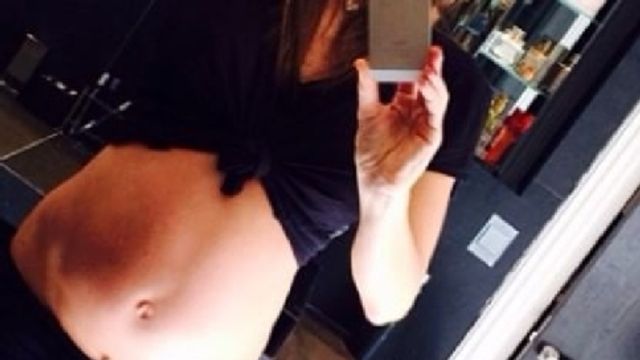 "9 months pregnant. CI Siamo quasi - 12 days !!!! Principessa in arrivo ... Strike the pose", Claudia Galanti mostra il suo pancione nudo, jeans a vita bassa e camicetta legata sotto il seno. La piccola Carolina Sky nascerà il 21 marzo e la modella paraguaiana è sempre più sexy.