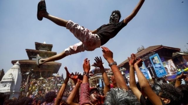 Un arcobaleno di viola, rosso, verde, giallo, blu colora Kathmandu dove centinaia di nepalesi si sono radunati per festeggiare la primavera e la vita, dopo la stagione dell'inverno. Holi festival coincide con il giorno successivo a quello della luna piena nel mese di Phalguna, del calendario induista.