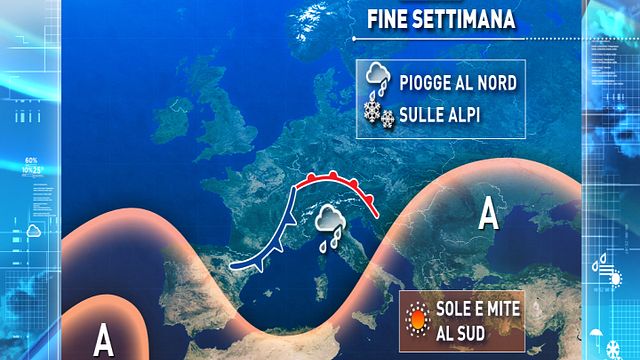 La tendenza per il weekend - Sabato inizia il vero peggioramento al Nord per l'arrivo della perturbazione: precipitazioni inizialmente concentrate sulle Alpi e nelle zone pedemontane del Nordovest, tra Levante Ligure e alta Toscana. Il Nordest comincerà a essere coinvolto solo dal pomeriggio. In generale fenomeni in intensificazione nella seconda parte del giorno. Le zone meno coinvolte dal peggioramento saranno Emilia Romagna e la fascia centrale della Val Padana. Verso sera rischio di rovesci o isolati temporali su Liguria, alto Piemonte, alta Lombardia e Friuli. Quota neve inizialmente anche sopra i 2000 metri, in calo fino ai 1300-1700 m solo nella notte. Domenica ancora maltempo al Nord, più marcato tra l'alta Lombardia e Triveneto. Quota neve in calo sull'arco alpino fino a 1000- 1400 metri di quota. Peggiora anche su settore tirrenico, fino alla Campania e in Sardegna. In serata le piogge raggiungeranno la Sicilia occidentale.