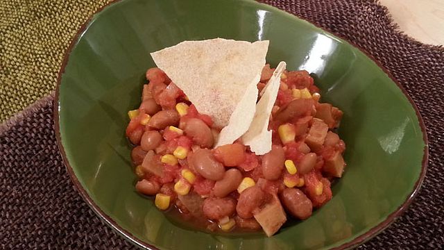 Rosolate in padella il seitan a bocconcini ed allungate con del brodo altrimenti il seitan vi rimane gommoso, cuocetelo per un 10 minuti. Mettete nella stessa padella un poco di evo, peperoncino, cipolla tritata, mais, fagioli pomododoro e seitan, infine salate e cuocete per qualche minuto.