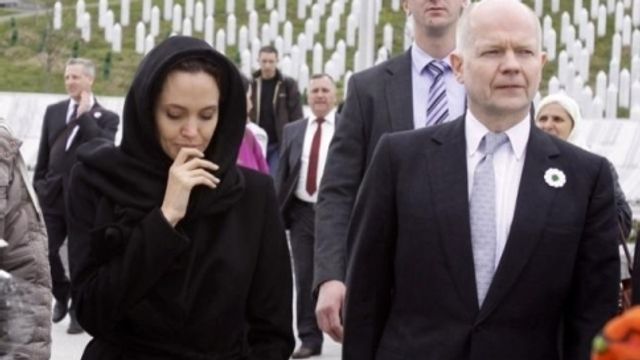 Angelina Jolie e il ministro degli Esteri britannico, William Hague, hanno visitato venerdì il cimitero di Srebrenica, nell'est della Bosnia-Erzegovina, dove hanno reso omaggio alle migliaia di vittime musulmane del massacro del luglio 1995. Come ha riferito Munira Subasic, presidente dell'organizzazione "Madri di Srebrenica", l'attrice ha lasciato la cittadina in lacrime e fortemente scossa dalle storie ascoltate dai familiari delle vittime.