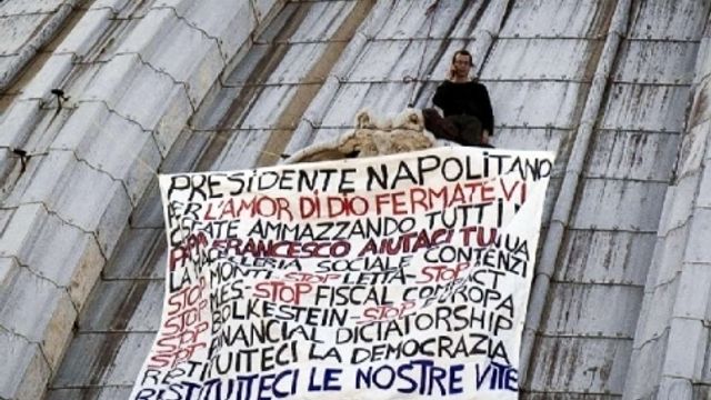 Ha passato la notte sulla cupola di San Pietro Marcello Di Finizio, l'imprenditore triestino che sabato pomeriggio è salito per la quarta volta sulla basilica per chiedere aiuto al Papa e a Giorgio Napolitano. "Fa un freddo boia e sono stanco morto - ha scritto la scorsa notte su Facebook - mandatemi tutta l'energia positiva che potete. Non possono vincere sempre i cattivi in questo Paese".