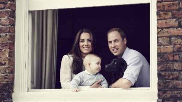 La foto ricordo immortala la famiglia dei duchi di Cambridge al completo, alla finestra di Kensington Palace, a Londra. Kate e William in posa con il piccolo principe George e spunta anche il cane.