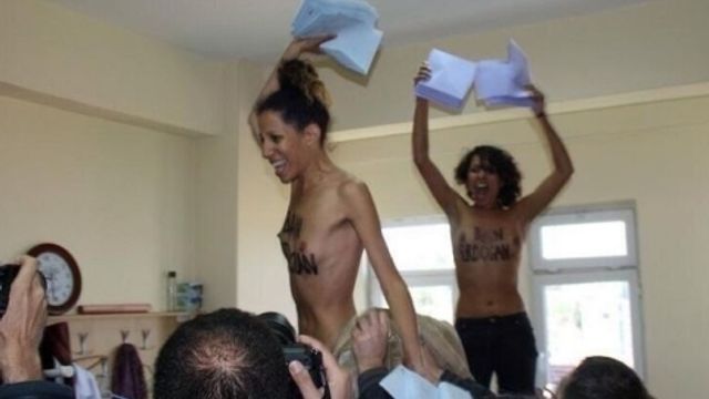 Due attiviste del movimento Femen hanno inscenato una protesta a seno nudo contro Recep Tayyip Erdogan nel seggio elettorale di Uskudar, sulla sponda asiatica di Istanbul, dove è solito votare il premier turco. Le due ragazze, con la scritta "Erdogan, Via" dipinta sul petto, sono salite sui tavoli del seggio lanciando schede elettorali, e gridando slogan contro il premier turco. Sono state fermate dalla polizia. Su Facebook le "sex-estremiste" turche hanno spiegato di avere voluto denunciare le spinte verso "la dittatura, la tirannia, la censura e un regime dei servizi segreti in Turchia impresse da Erdogan". Le Femen hanno denunciato anche il bando imposto a Twitter e YouTube, la creazione di "uno stato di polizia e la islamizzazione forzata" del Paese.
