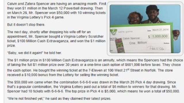 Due settimane di fortuna sfacciata - La fortuna dei signori Spencer è cominciata il 12 marzo, quando hanno indovinato i primi cinque numeri del Powerball: 15-15-28-37-54. Un colpo da 1 milione di dollari, che avrebbe potuto essere ben maggiore se avessero indovinato anche il numero Powerball (10). In quel caso la vincita sarebbe stata di 60 milioni.