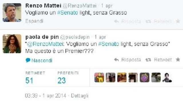 Gaffe della senatrice Paola De Pin (ex M5S) che su Twitter scambia un fake del premier per il vero Matteo Renzi. "Vogliamo un #Senato light, senza Grasso", cinguetta @RenzoMattei (che nulla ha a che vedere con il profilo ufficiale del presidente del Consiglio) cavalcando la polemica dei giorni scorsi sollevata dal presidente del Senato sull'abolizione di Palazzo Madama. "Ma questo è un Premier???", risponde l'ex grillina.