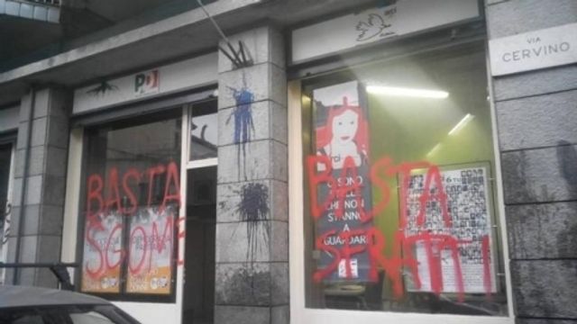 Un corteo non autorizzato ha attaccato il circolo Pd di via Cervino, a Torino. Alcuni dei manifestanti hanno imbrattato i muri con scritte, rivolto insulti ai militanti del partito che si trovavano in quel momento nei locali e lanciato all'interno della sede due fumogeni. Lo denuncia il senatore Stefano Esposito, che parla di "squadrismo fascista".