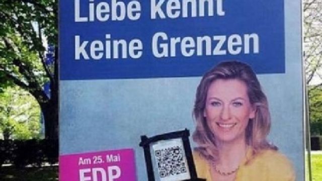 Già deputata tedesca all'europarlamento, Alexandra Thein si è ricandidata per le elezioni del 25 maggio tappezzando Berlino con i suoi poster elettorali con lo slogan "l'amore non conosce confini". Ma qualcuno le ha tirato un tiro mancino, applicando ai manifesti un codice QR (leggibile dagli smartphone) che rimanda a un film porno con lo stesso titolo: 22 minuti di sesso di gruppo.