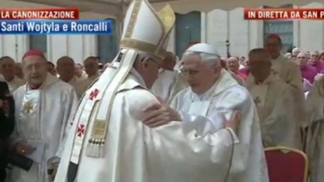 Uno scrosciante applauso si è levato dalla folla al momento dell'uscita in processione dalla basilica di San Pietro di Papa Francesco. Il pontefice si è quindi recato a salutare Benedetto XVI, e i due Papi si sono abbracciati. Al termine della funzione, nuovo e caloroso abbraccio tra Bergoglio e il suo predecessore.
