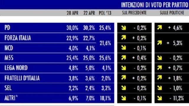 Il M5S guadagna consensi passando dal 25% al 25.4%. Sempre bene la fiducia nei confronti del Governo Renzi: il 43.2% degli intervistati esprime un giudizio positivo, contro un 33.8% di giudizi negativi. Se si votasse oggi per le Elezioni Europee, il 28.9% degli intervistati voterebbe Pd, il 27.4% il M5S e il 21.3% Forza Italia.