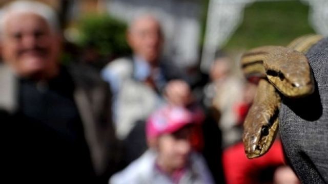 Oltre ventimila persone si sono date appuntamento per il tradizionale e antichissimo rito dei serpari di Cocullo, in cui la statua di San Domenico viene portata in processione 'vestita' di serpenti vivi catturati nei campi il mese precedente e appositamente preparati. La tradizione vuole che San Domenico abbia il potere taumaturgico contro il morso dei serpenti e dei lupi. Ma anche quello di guarire il mal di denti. E proprio per invocare la sua protezione i fedeli, nel giorno della festa, suonano una campanella posta all'interno della chiesa, utilizzando i denti.