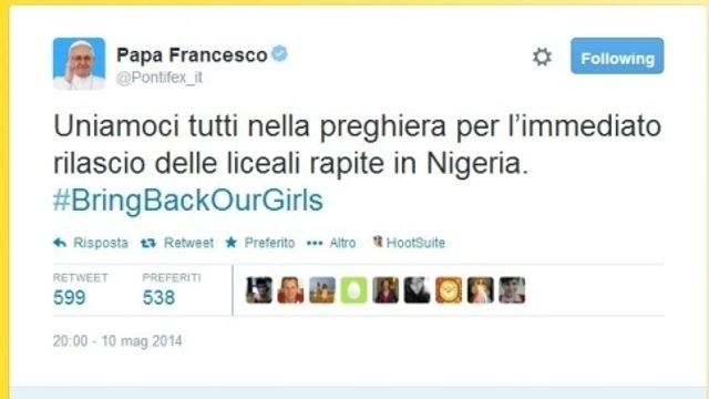 "Uniamoci tutti nella preghiera per l'immediato rilascio delle liceali rapite in Nigeria". Lo scrive in un tweet il Papa aderendo alla campagna #BringBackOurGirls. La mobilitazione per liberare le cento studentesse nella mani di un gruppo integralista islamico è ormai mondiale. A capeggiare il movimento c'è Michelle Obama: "In quelle ragazze io vedo le mie figlie".