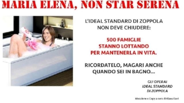 Solo schiuma su Maria Elena Boschi, ritratta in vasca da bagno. Matteo Renzi seduto sul wc. Il "trono" di Beppe Grillo è il bidet. Questa la campagna destinata a far parlare di sé promossa dagli operai della Ideal Standard di Orcenico di Zoppola, in provincia di Pordenone. Nei manifesti, con i fotomontaggi dei rappresentanti politici più in vista, lo slogan che cita il celebre #enricostaisereno di Renzi con un "Non star sereno".