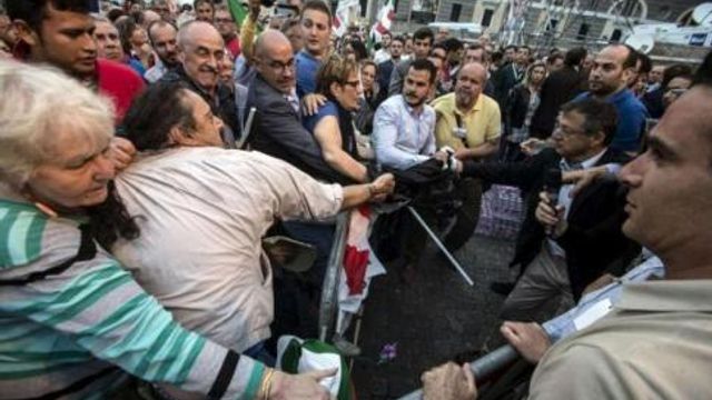 Sono oltre 40 le persone fermate dalla Digos a Roma dopo i momenti di tensione che si sono verificati durante le contestazioni rivolte al premier Matteo Renzi, al comizio del Pd in piazza del Popolo. In terra, in piazza, è stato anche trovato un pugnale con una lama di diversi centimetri.