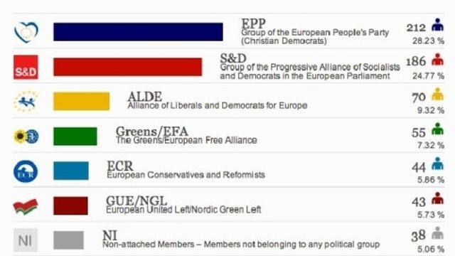In attesa di conoscere i dati definitivi sul voto che ha coinvolto 28 Paesi, il Parlamento Europee raffigura con un'infografica la probabile distribuzione dei seggi. I popolari dell'EEP si confermano prima forza politica a livello comunitario con il 28,23% dei seggi e circa 212 seggi. Seguono i socialisti e democratici della S&D che aumentano i loro consensi ma si fermano al 24,7% e conquistano 186 seggi; più staccati i liberali dell'Alde con il 9,3% e 70 seggi: seguono i Verdi con 55 seggi pari al 7,32 complessivo; dietro ci sono i conservatori con il 5,8 e 44 seggi, vicinissimi alla sinistra del Gue/NGL; sono infine 38 i membri del gruppo misto, 36 quelli della EFD e 67 i deputati di cui ancora non si conosce l'esatta collocazione (tra i quali ci saranno gli eletti del Movimento 5 Stelle). In questo scenario la poltrona del Presidente della Commissione Europea sarà contesa tra Popolari, Socialisti e Liberali.
