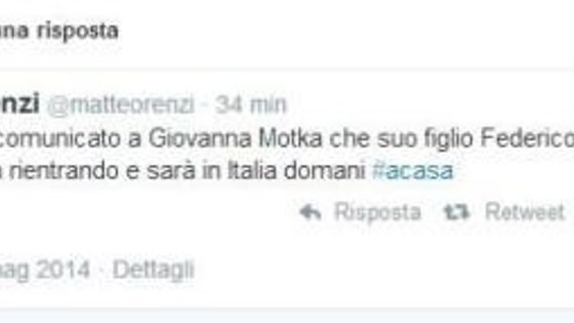 "Ho appena comunicato a Giovanna Motka che suo figlio Federico, sequestrato il 13 marzo del 2013 ad Atmeh, in Siria, sta rientrando e sarà in Italia domani. #acasa". Lo scrive su Twitter il premier Matteo Renzi. Motka lavora presso una Ong.