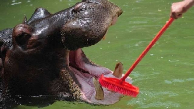 Un guardiano del parco-foresta di Qingdao, nella provincia cinese di Shandong, spazzola i denti a un ippopotamo. D'estate questa operazione di igiene sugli ippopotami viene eseguita due volte alla settimana.