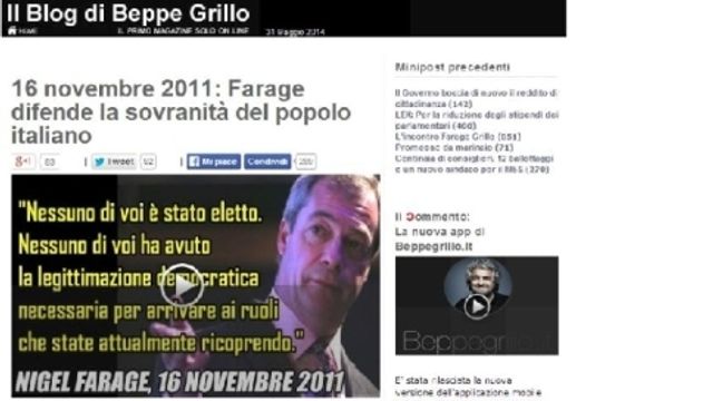 Beppe Grillo continua a difendere Nigel Farage. In un post pubblicato sul suo blog, il leader del Movimento 5 Stelle ricorda un discorso pronunciato al Parlamento europeo dal numero uno dell'Ukip il 16 novembre del 2011. "Accusò i burocrati europei di avere rimpiazzato il governo greco con un governo marionetta e di avere sostituito Berlusconi con Monti. Terminò chiedendo cosa, in nome di Dio, avesse dato loro il diritto di farlo", scrive Grillo.