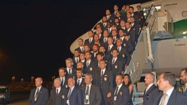 L'A330 dell'Alitalia con a bordo la Nazionale italiana di calcio è decollato intorno a mezzanotte dall'aeroporto romano di Fiumicino alla volta del Brasile per i Mondiali. Prima della partenza, gli azzurri hanno posato, tutti schierati, per una foto ricordo sulle scalette dell'aereo. Particolarmente sorridenti sono apparsi Antonio Cassano e Gigi Buffon, che hanno scherzato a lungo davanti ai fotografi.