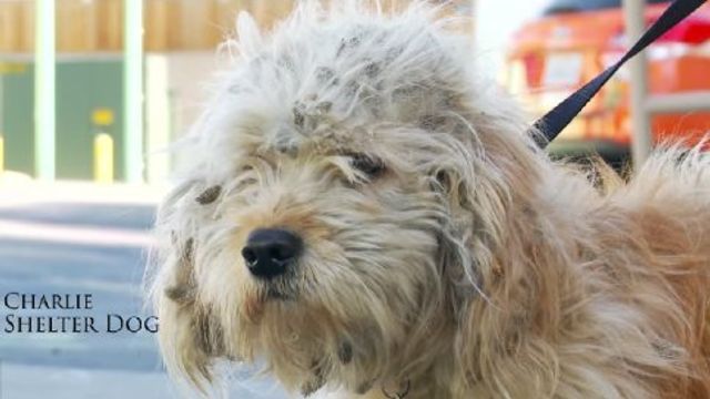 Trovato mentre vagava ai bordi di una strada, Charlie era stato portato in un canile di Los Angeles. Con il pelo lungo, sporco e coperto dal naso alla coda di dolorosi frutti uncinati di piante della zona, il cagnolino rischiava di morire: il canile nel quale era stato portato, infatti, è uno di quelli con il più alto tasso di eliminazioni. Così le associazioni animaliste si sono date da fare e, per far adottare velocemente Charlie, l'hanno fatto trasformare.