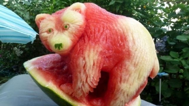 Mostriciattoli, coccodrilli o vichinghi con tanto di corna prendono forma da un'anguria. A scolpire con pazienza certosina il frutto più amato della stagione estiva è l'artista Clive Cooper. Le incisioni sono iper dettagliate, si vedono le rughe nei volti umani, i peli sull'orso bruno e le minime scanalature nel palato dello squalo. Per vedere altri suoi lavori si può visitare il sito Spark's Fly Design.