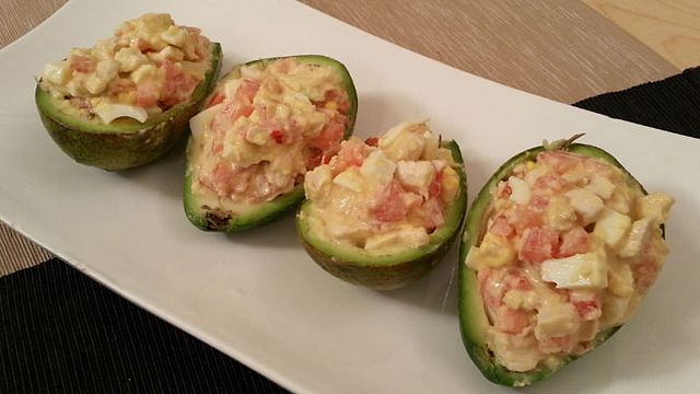 Procedimento: tagliate a metà i due avocado, levate il nocciolo, scavate un po' di polpa attorno al buco e raccoglietela in una terrina.