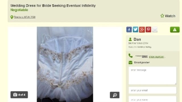 "Vi sposerete presto? Avete intenzione di non restare fedeli a vostro marito? Allora ecco questo potrebbe essere l'abito che fa per voi". Con questo annuncio Dan, un 32enne di Sydney, ha messo all'asta l'abito della ex moglie, con la quale, ovviamente, la storia non ha avuto un happy end.
