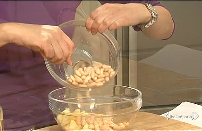 Sminuzzate le noci, tagliate le uova sode a dadini e amalgamate il tutto mescolando con dell'olio e un pizzico di sale.