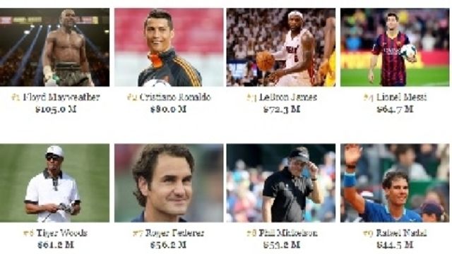Come ogni anno la rivista americana Forbes ha pubblicato la classifica dei cento sportivi più pagati nel 2014. Sul gradino più alto del podio il pugile Floyd Mayweather, con un totale di 105 milioni di dollari (circa 77 milioni di euro). Il 37enne statunitense quest'anno è stato sul ring solo 72 minuti, il che significa che ha guadagnato più di un milione di euro a minuto (non per niente è soprannominato "Money"). Un gradino più in basso nella classifica dei paperoni c'è Cristiano Ronaldo (circa 60 milioni di euro), mentre a completare il podio troviamo LeBron James, stella dei Miami Heat (53,4 milioni di euro incassati nell'ultimo anno).