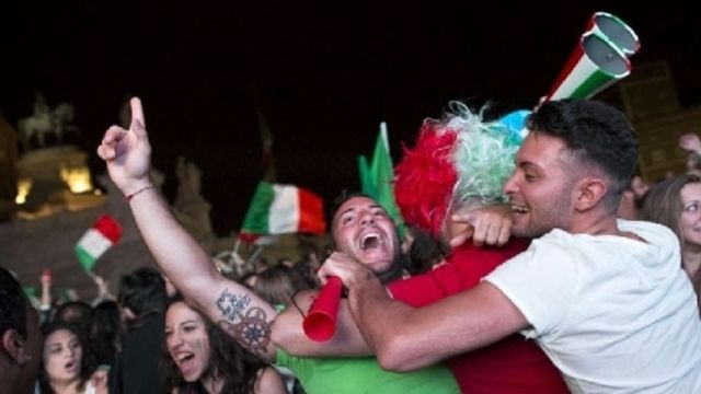 Ballando e sventolando bandiere tricolori, centinaia di tifosi hanno festeggiato fino a tarda notte davanti ai maxi-schermi nelle varie città d'Italia dopo la vittoria 2-1 dell'Italia sull'Inghilterra. Parrucche, fumogeni e trombette sono stati usati per esprimere la gioia per il primo successo della nazionale. Molti avevano disegnato sul volto il tricolore e tanti indossavano la maglia azzurra, soprattutto quella con il numero 9 di Balotelli.