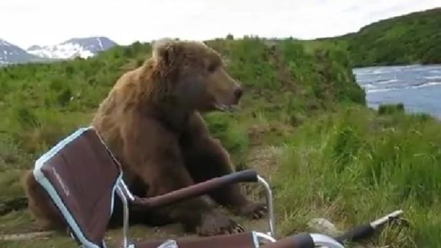 Con passo lento e un po' di fiatone si avvicina al campeggiatore. Ma questo enorme orso bruno sembra davvero troppo stanco per attaccare: così guarda il fiume che scorre a pochi metri da lui e si siede accanto alla sdraio del turista, incuriosito e affascinato da quello strano oggetto che sembra ai suoi occhi così comodo... Dopo poco si rialza e si allontana, sempre preoccupandosi di non arrecare disturbo al turista.