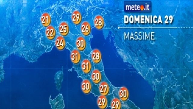 Le temperature massime saranno in calo su Alpi e Nordovest a causa del maltempo. Valori in aumento al Centrosud per effetto di moderati venti meridionali con punte anche oltre i 30 gradi al Sud e nelle Isole, fino ai valori prossimi ai 35°C in Sicilia (Palermo e Bari saranno città più calde rispettivamente con 35°C e 33°C).