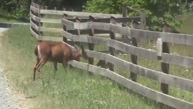 Il piccolo daino è troppo esile per trovare la forza di saltare quell'alto recinto. La madre, però, non si perde d'animo e, resasi conto dell'impossibilità di convincere il suo cucciolo a tentare di imitarla per superare dall'alto la staccionata, lo conduce piano piano a una piccola buca permettendogli di superare la recinzione. Liberato il piccolo intrappolato, i due proseguono la loro passeggiata. Lei davanti e lui subito dietro che cerca di tenere il passo.