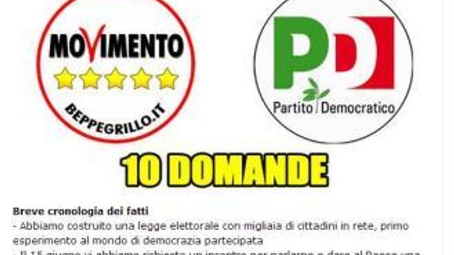 "Dieci risposte a dieci domande". Con questo titolo il M5S pubblica sul blog di Beppe Grillo le dieci risposte al Pd sulle riforme e sulla legge elettorale a testimoniare "la massima disponibilità al confronto e al dialogo" e per fare in modo che il Pd "non abbia più alibi". Con dieci sì, e le dovute osservazioni, il M5S accoglie di fatto le dieci proposte del Pd.