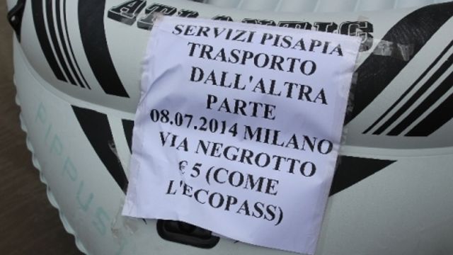 Milano, via Negrotto, una delle zone maggiormente colpite dal maltempo che martedì si è abbattuto sulla città lombarda, creando allagamenti e disagi. La polemica esplode fra gli abitanti alle prese con strade allagate e l'impossibilità di muoversi e così ecco che, canotto e remi "alla mano", viene messo in campo un sistema di mobilità urbana alternativa. Il prezzo del "biglietto"? Cinque euro, quanto il costo dell'Ecopass introdotto dalla giunta Pisapia.