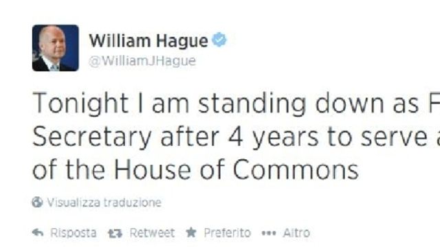 "Mi dimetto da ministro degli Esteri per diventare leader della Camera dei Comuni". Lo ha annunciato il capo della diplomazia britannica, William Hague, con un tweet. "Non mi presenterò alle elezioni del maggio 2015" e dopo "un così lungo periodo in politica voglio impegnarmi in molte altre cose che ho sempre voluto fare" scrive. "Voglio finire" così "come ho cominciato", afferma, facendo politica "in Parlamento e facendo campagna tra gli elettori".