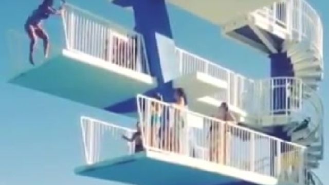 Tenta un tuffo dalla piattaforma di 7 metri ma poi, presa dal panico, ci ripensa. Vorrebbe fermarsi ma riesce solo ad aggrapparsi alla ringhiera laterale. La presa non è salda, così scivola finendo di pancia sul trampolino sottostante e alla fine precipita in acqua. Fortunatamente la ragazza ha riportato solo ferite superficiali. L'incidente è avvenuto nel parco acquatico americano Lava Hot Springs dell'Idaho. E il video della caduta è diventato virale.