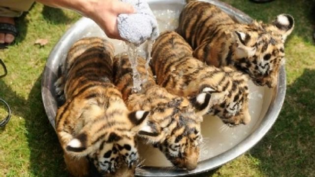 Siamo a Yangzhou, uno zoo della provincia di Jangsu in Cina. E i quattro cuccioli di tigre rischiano di soffrire il gran caldo di questi giorni. Così, un impiegato del posto pensa bene di concedere ai tigrotti un bel bagno rinfrescante. I tigrottini si godono la frescura e l'addetto dello zoo ne approfitta per strigliarli per bene, dando ai piccoli una bella ripulita.