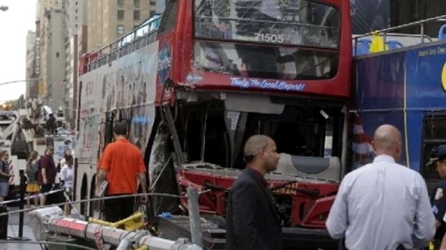 Almeno 14 persone sono rimaste ferite nello scontro fra due bus turistici avvenuto a New York. L'incidente ha coinvolto due pullman a due piani ed è avvenuto a Times Square. Delle persone coinvolte, undici hanno riportato ferite lievi mentre tre sono gravi e sono stati subito trasportati al St. Luke's Roosevelt Hospital. I medici hanno riferito che non sono in pericolo di vita. L'autista di uno dei due mezzi coinvolti è stato arrestato.