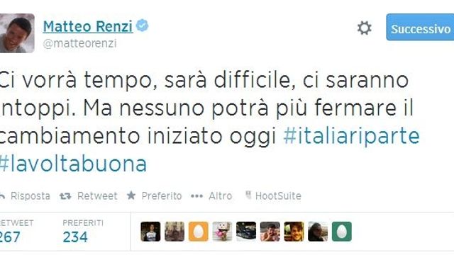 "Ci vorrà tempo, sarà difficile, ci saranno intoppi. Ma nessuno potrà più fermare il cambiamento iniziato oggi #italiariparte #lavoltabuona". Lo scrive su Twitter il premier Matteo Renzi a pochi muniti dall'approvazione del ddl sulle riforme al Senato, passato con 183 voti a favore.