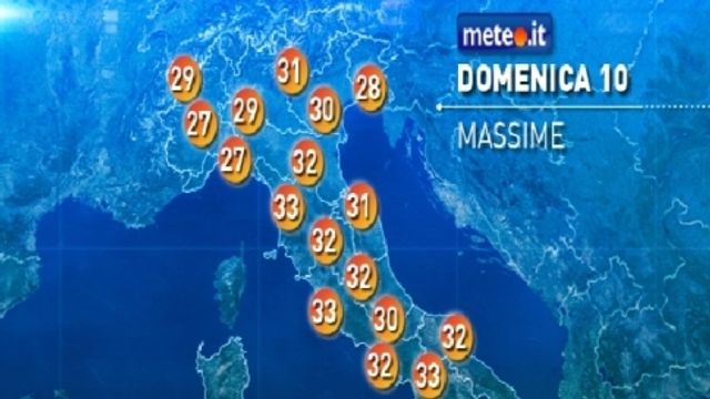Temperature massime quasi ovunque in crescita, in generale comprese tra 28 e 33 gradi ma con punte vicine ai 35 gradi al Centrosud, fino a 36-37 sulla Sardegna occidentale.