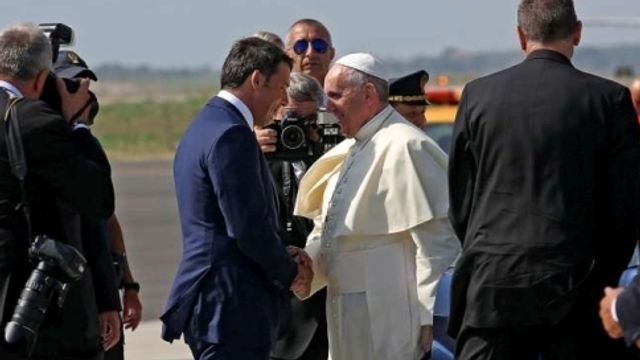 Papa Francesco ha portato da solo la sua borsa di pelle nera. Appena sceso dalla vettura, Bergoglio, sorridente, è stato accolto dal presidente del Consiglio, con il quale si è intrattenuto cordialmente per un paio di minuti. Nel suo viaggio il Pontefice è accompagnato dal segretario di Stato Vaticano, cardinale Pietro Parolin.
